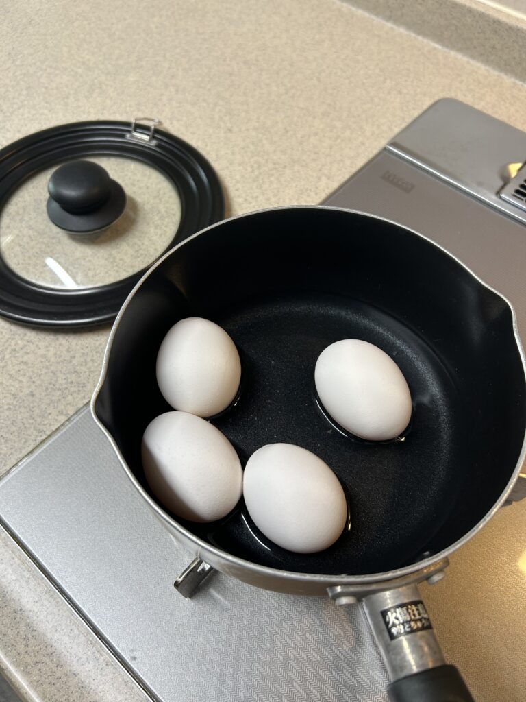 1. 鍋に卵を入れ、卵が少し浸かる程度に水を1cmそそぐ